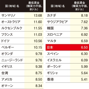 アトキンソン:世界的に見ても日本の最低賃金は非常に低い水準です(下図表参照)。私はこれまで賃上げの重要性を訴えてきました。人口が減少する中でも、社員一人一人の生産性を高めれば、給料を上げることができる。給料が上がれば、必要な人材を確保できます。つまり最低賃金を上げられる経営者は生き残ることができる。言い換えれば、賃金を上げられない会社は倒産します。