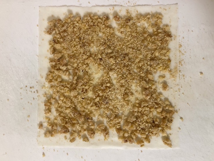 用意するものは、春巻きの皮2枚、クルミ60グラム、砂糖、バターのみです。春巻きの皮に溶かしバターを薄く塗り、砂糖を適量まぶします。こってり目のバクラヴァが好きな方はバターを多めに、甘めが好きな方はお好みで砂糖の量を調整してください。そこに、細かく砕いたクルミをまぶし、手前からくるくると巻いていきます。