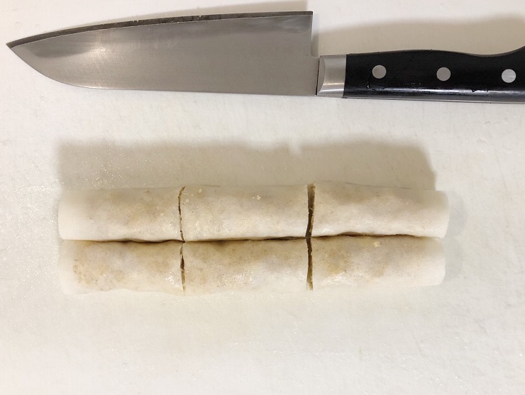 もう一枚の春巻きの皮も同様にしたら、綴じ目を下にして3等分に切り分けます。これを180度に予熱しておいたオーブンで8分ほど焼けば完成です。