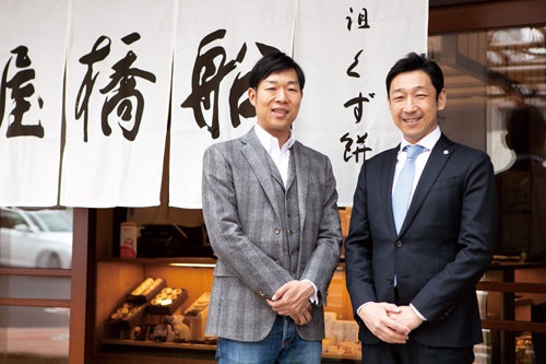 船橋屋8代目の渡辺社長(右)と、平和酒造4代目の山本社長(左)は共に業界の変革者だ(写真/小野さやか)