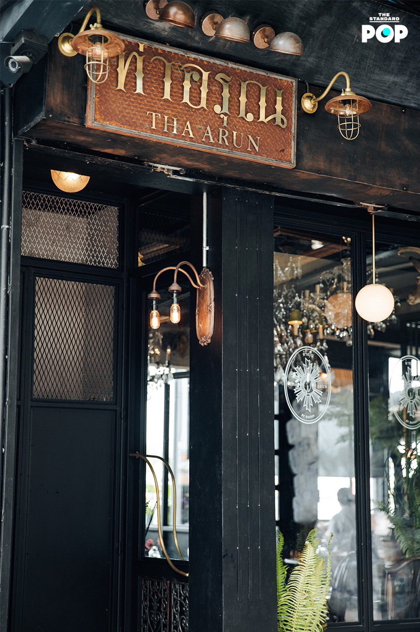 “ช่วงนั้นการค้าทางเรือกำลังเจริญมาก ทุกที่ต้องมีท่าเรือเพื่อขนถ่ายสินค้า ความงอกงามเกิดจากการค้า ร้านของเราก็ตั้งตรงท่าเรือของท่าเตียน เลยคิดถึงคำว่า ท่า ขึ้นมา นี่จึงเป็นที่มาของชื่อร้านท่าอรุณ คือท่าของการรับถ่ายสินค้า และร้านเราอยู่ตรงข้ามวัดอรุณฯ ผมมองว่าพื้นที่ในท่าเตียนเหมือนแลนด์มาร์กของกรุงเทพฯ ไปแล้ว เปรียบเทียบเหมือนไปฝรั่งเศส คนต้องไปดูหอไอเฟล ถ้าต่างชาติมาไทย เขาก็ต้องมาดูพระปรางค์วัดอรุณฯ ชื่อร้านจึงได้สองความหมาย ทั้งตั้งตรงข้ามพระปรางค์วัดอรุณฯ และความหมายในคำว่า ท่า หรือ พอร์ต ที่รับเอาจากตะวันตกเข้ามา”