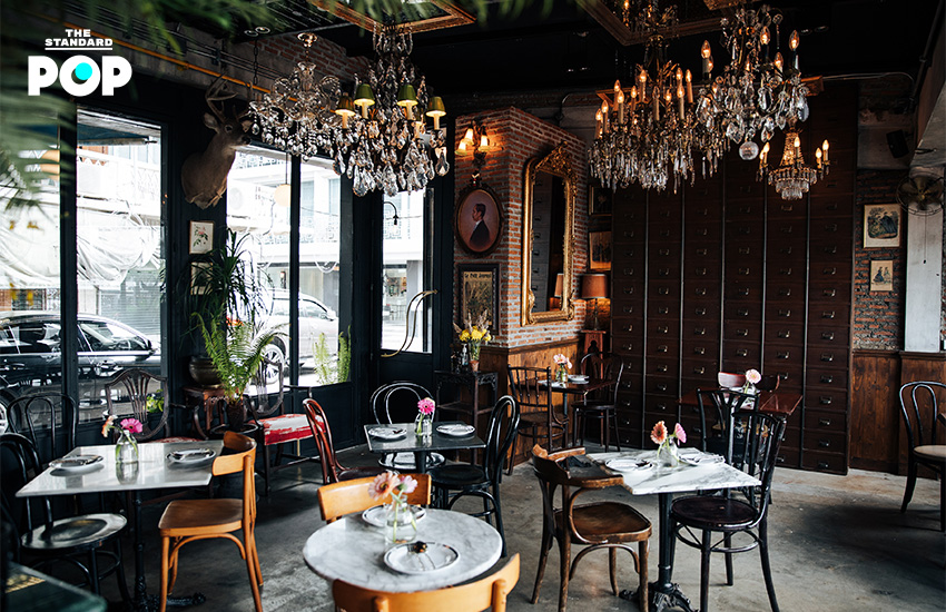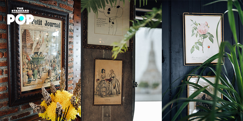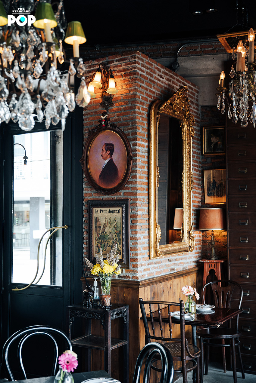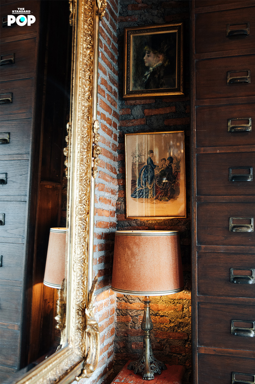 “ส่วนภาพต่างๆ ที่ประดับในร้านเป็นของสะสมในรัชกาลที่ 5 ซึ่งตรงกับยุควิกตอเรียน มีช่างฝรั่งเข้ามาเพนต์พอร์ตเทรตในไทยกันเยอะมาก ผมเลยพยายามหาทั้งภาพนูนต่ำ ภาพพิมพ์หิน ภาพเพนต์ในยุคที่ใกล้เคียงกับสมัยรัชกาลที่ 5 แล้วเอามาใช้ผสมผสานกัน”